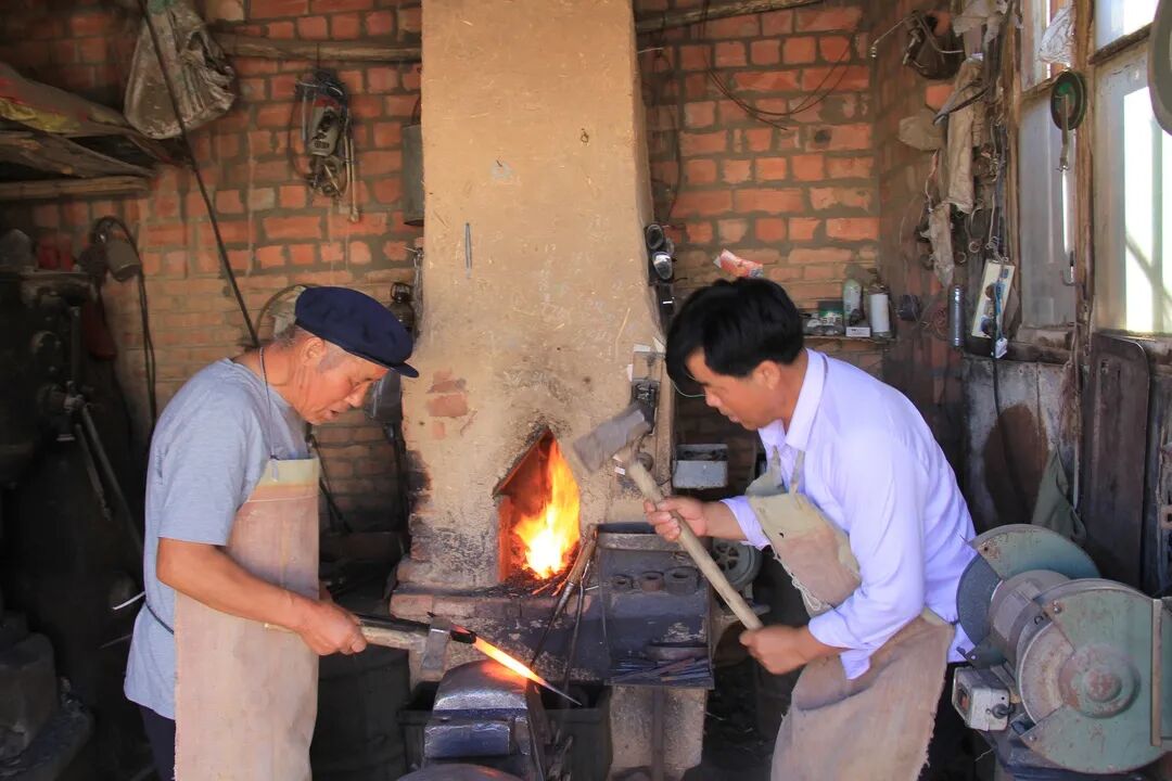 今年79岁的老铁匠郭开光出生在甘肃省民勤县东湖镇乡西岁村的一个铁匠世家,从他的曾祖父打铁算起,到他儿子这一辈,已经整整历经了五代。郭开光老人很小的时候就在家看着父辈们打铁,有时也帮着做一些活,时间长了耳濡目染,也就渐渐学到了一些打铁的流程和章法。初中毕业后,他正式拜师学艺跟上父亲打铁。“七十二行,铁匠为王。”铁匠是让郭开光老人引以为豪的职业。打铁虽然是力气活,但更是一门手艺,同样是铁匠,技术有高下之分,学习打铁不能光出力,还要善于动脑子,才能开窍,进步的才快。打铁是活里求财,父亲不光给他传承手艺,还教导他为人做事的道理。